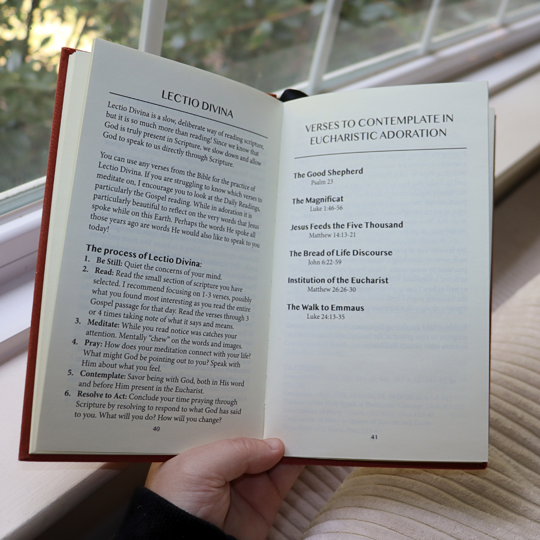 Adoration Guide for Parents is a beautiful hard-bound, cloth-covered book which will serve as a powerful companion for any parent in Eucharistic Adoration. Printed as a 4”x6” book, the Adoration Guide for Parents will easily fit in any purse or bag you take to your Adoration hour.