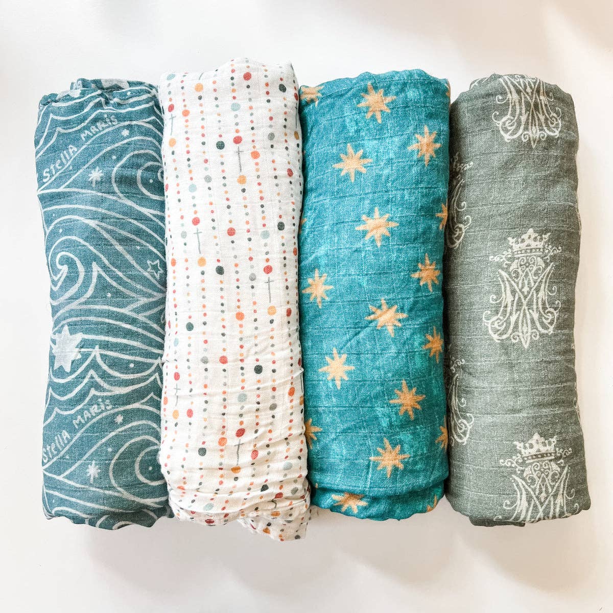 Soft and flowy bamboo/cotton muslin swaddles to wrap your precious babes in Mary's Mantle.