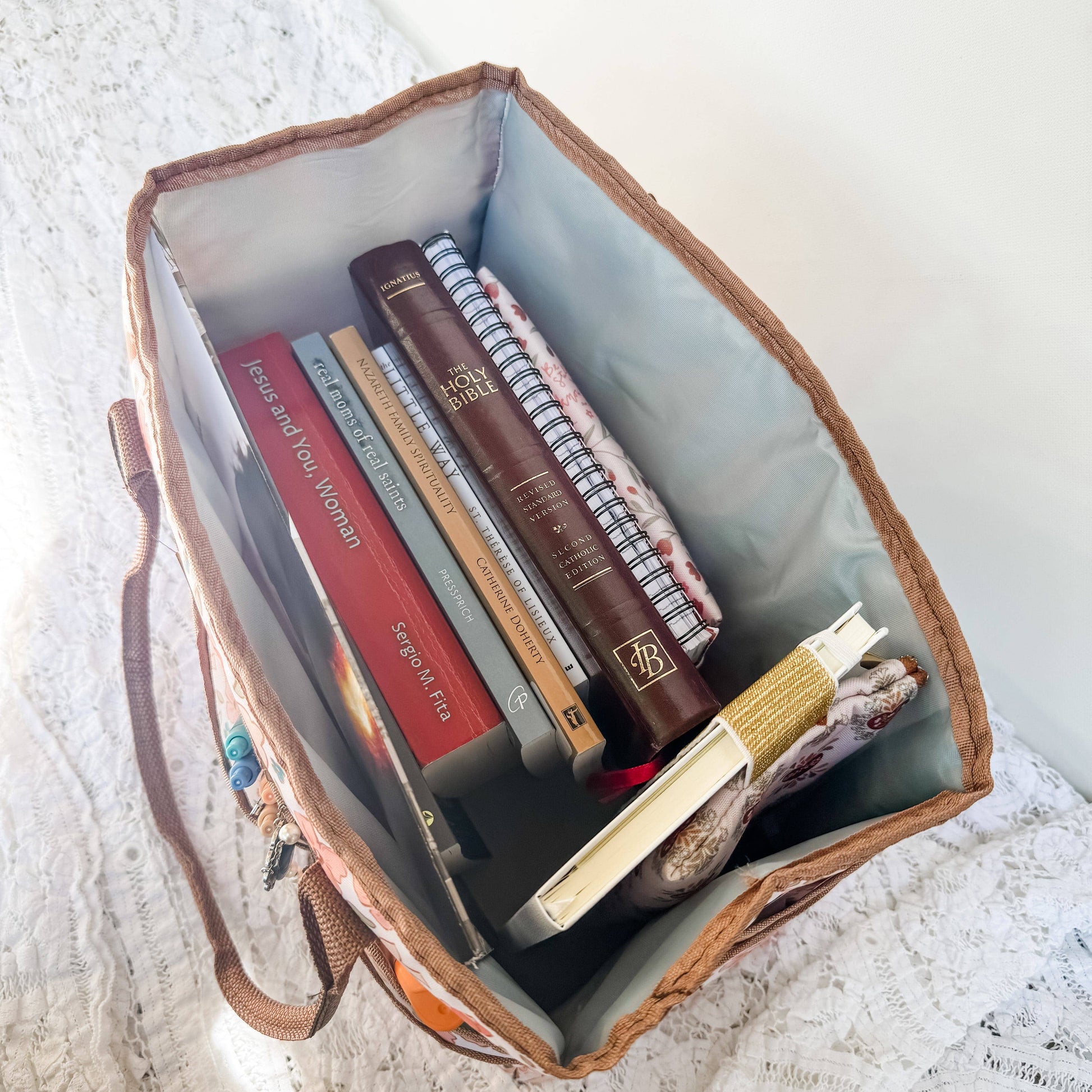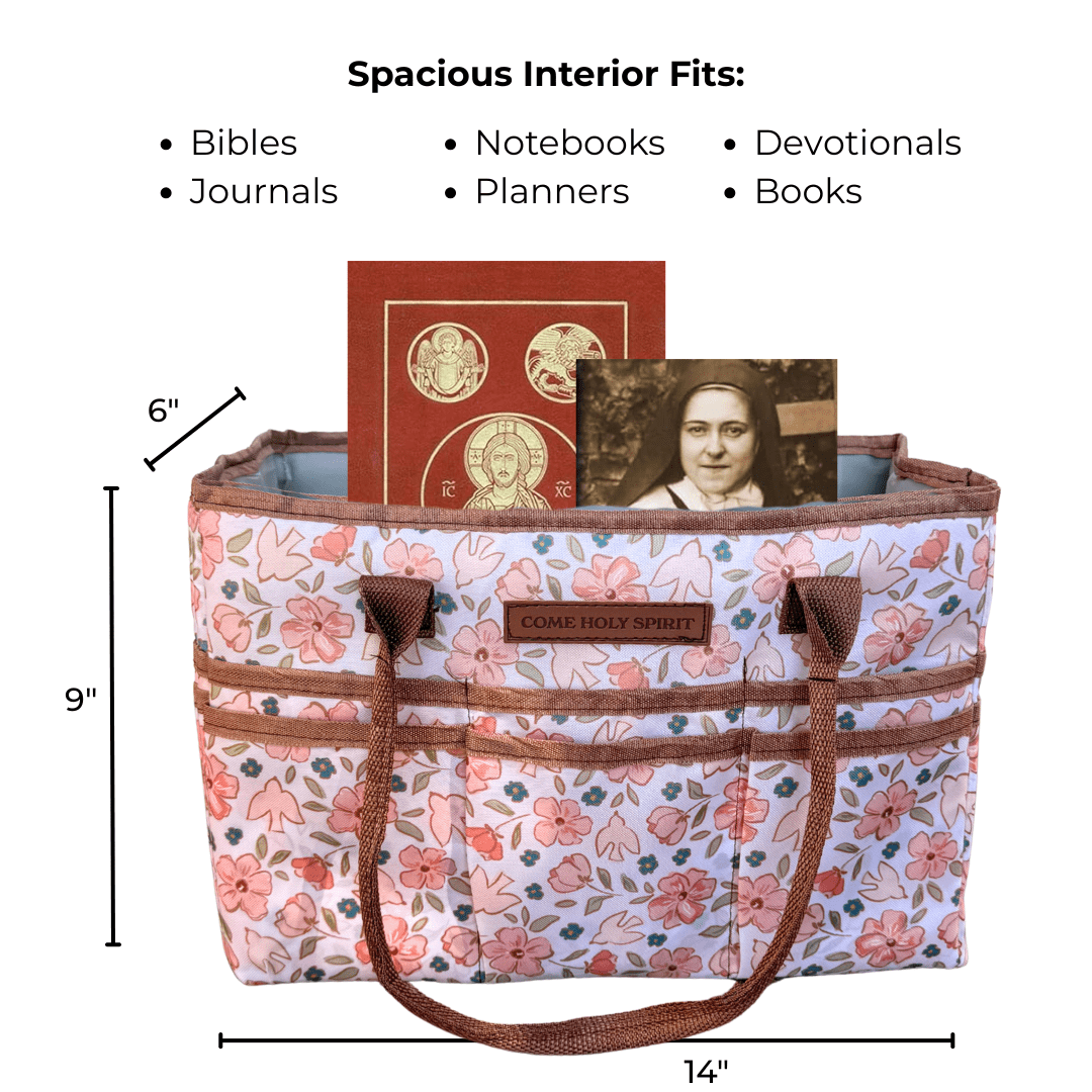 This caddy features18 exterior pockets for easy access to small items like prayer cards, pens, or rosaries, and a spacious open interior to hold larger items like Bibles, journals, and books. It’s easy to carry with durable double handles and is finished with a stitched faux leather patch that reads “Come Holy Spirit”—a gentle and beautiful reminder of who leads our hearts and homes. The soft floral pattern adds a touch of charm, making it a lovely addition to any sacred space.