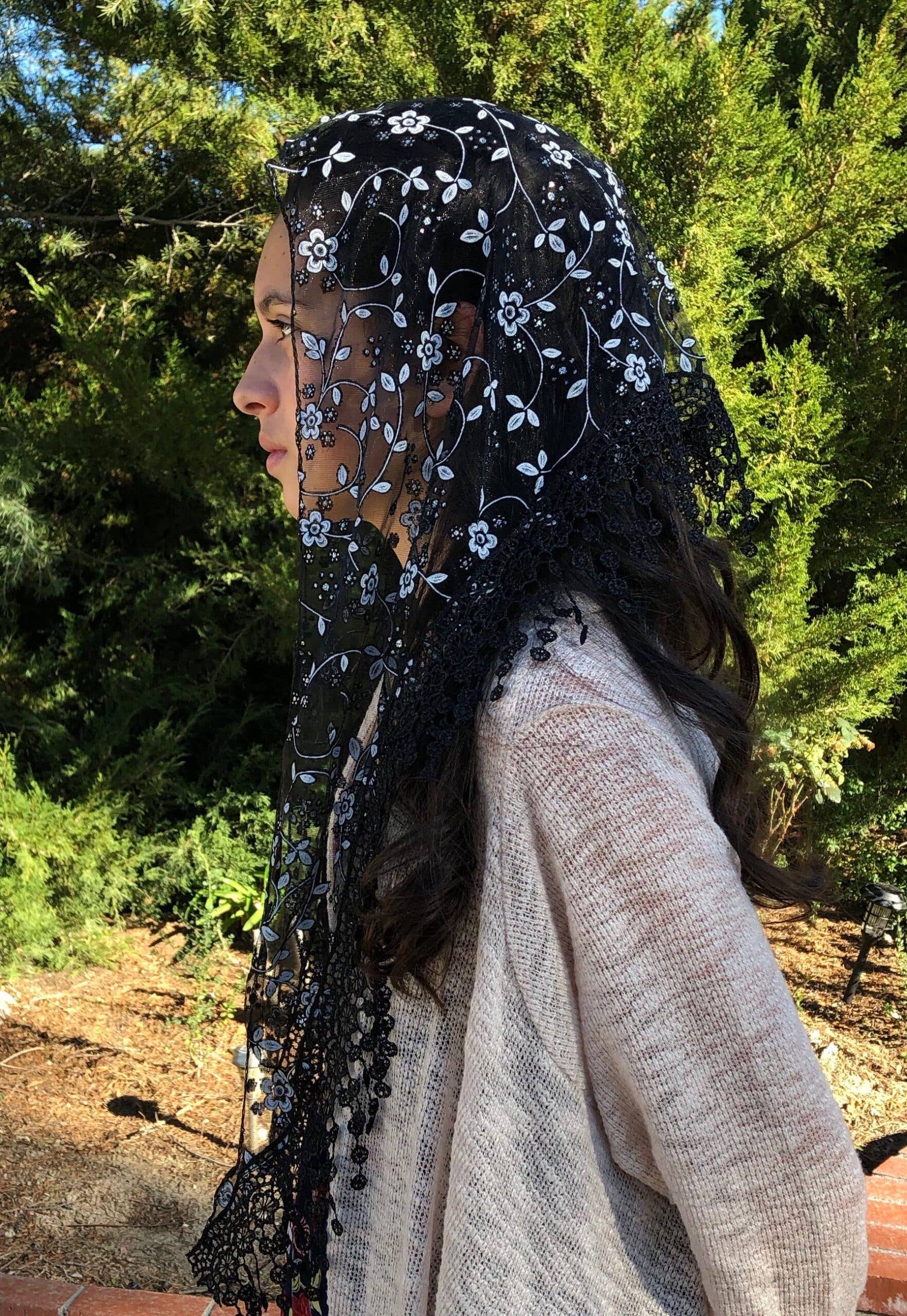 Cherry Blossom is one of our most popular Church Veils, perfect for all ages and a good starter for anyone, made with soft BLACK material and matching color lace around the edge. This gives a great touch to this nice starters veil, the lace material comes enhanced with glitter around the little flowers and leaves. NOTE: Wash by hand only, lay flat to dry. Measurements: 48″ x 13″. Veil clip included