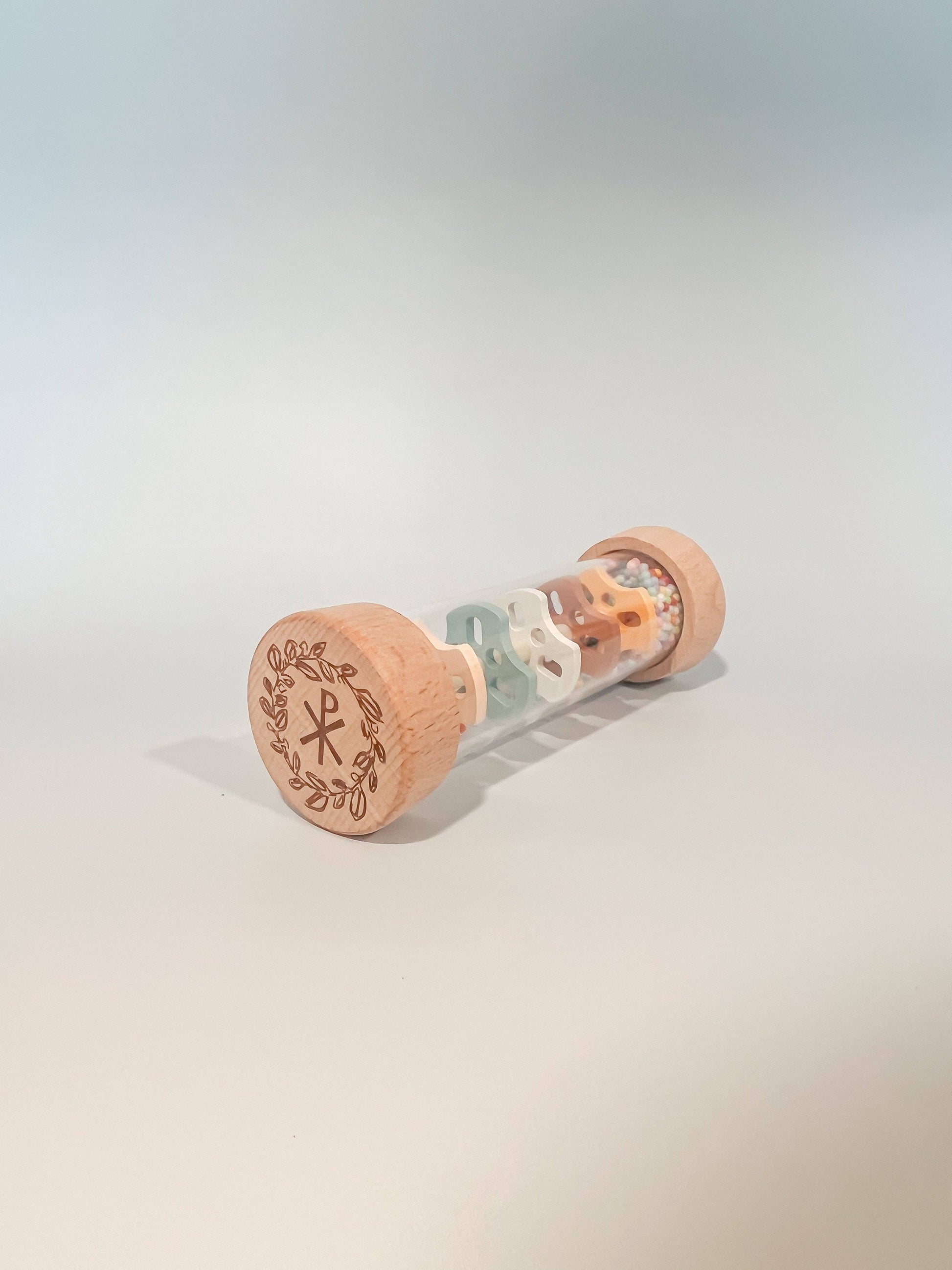 Introduce your child to the beauty of nature and faith with the Chi-Rho Christian Beaded Raindrops, a Montessori-inspired wooden rainmaker. This tactile and auditory toy is designed to gently stimulate the senses as colorful beads cascade inside, mimicking the soothing sound of rainfall. Perfect for young hands, it encourages exploration of cause-and-effect, hand-eye coordination, spirituality and mindfulness.
