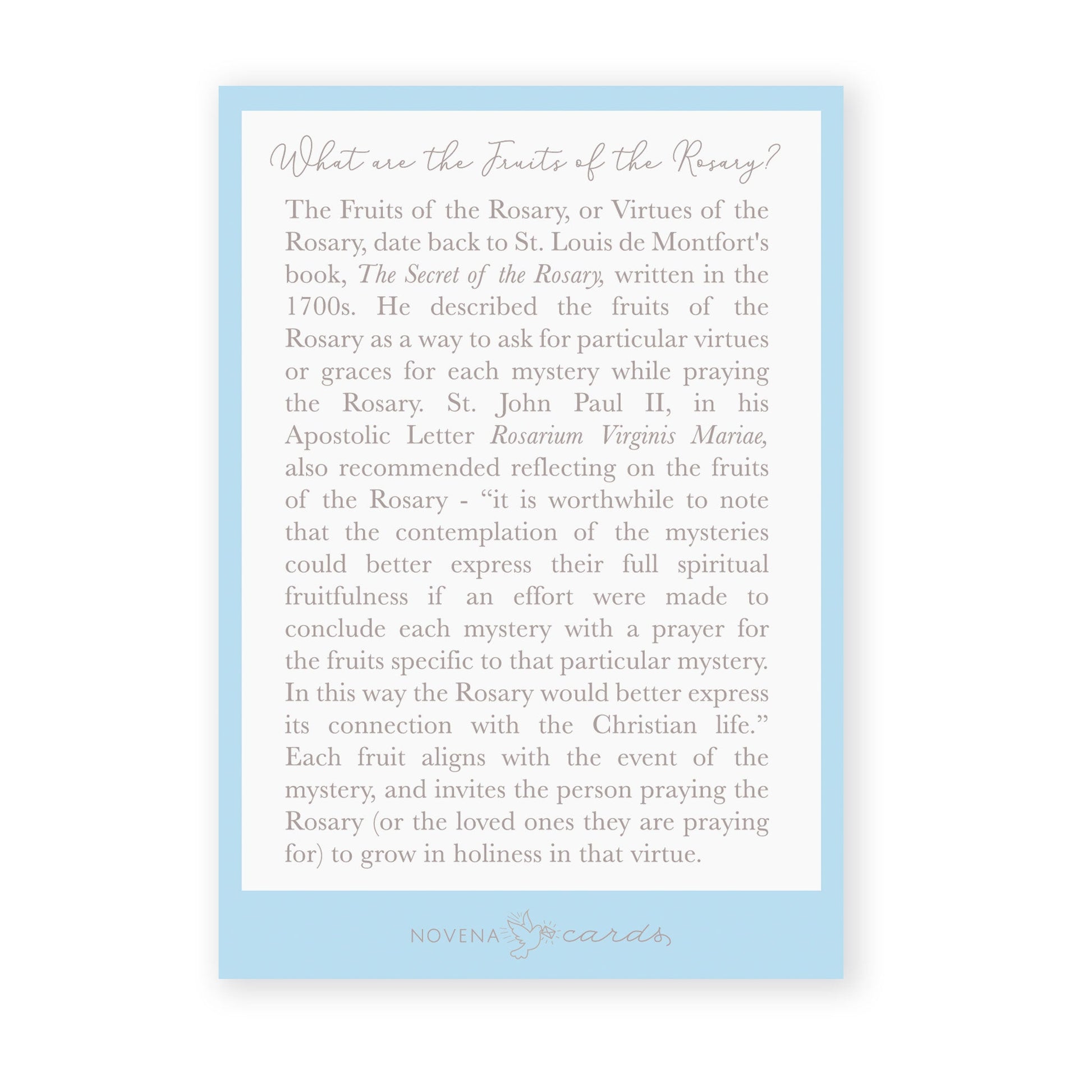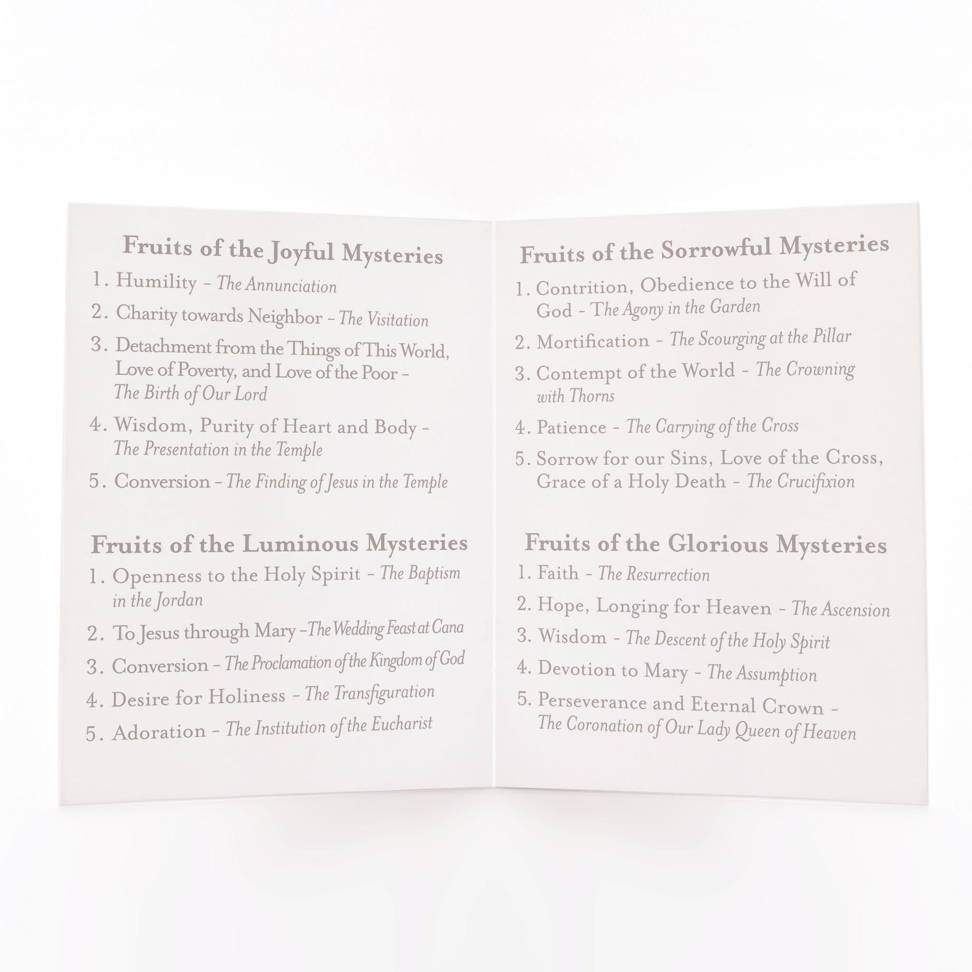 - Inside of Card: Fruits of the Rosary with associated Mysteries of the Rosary