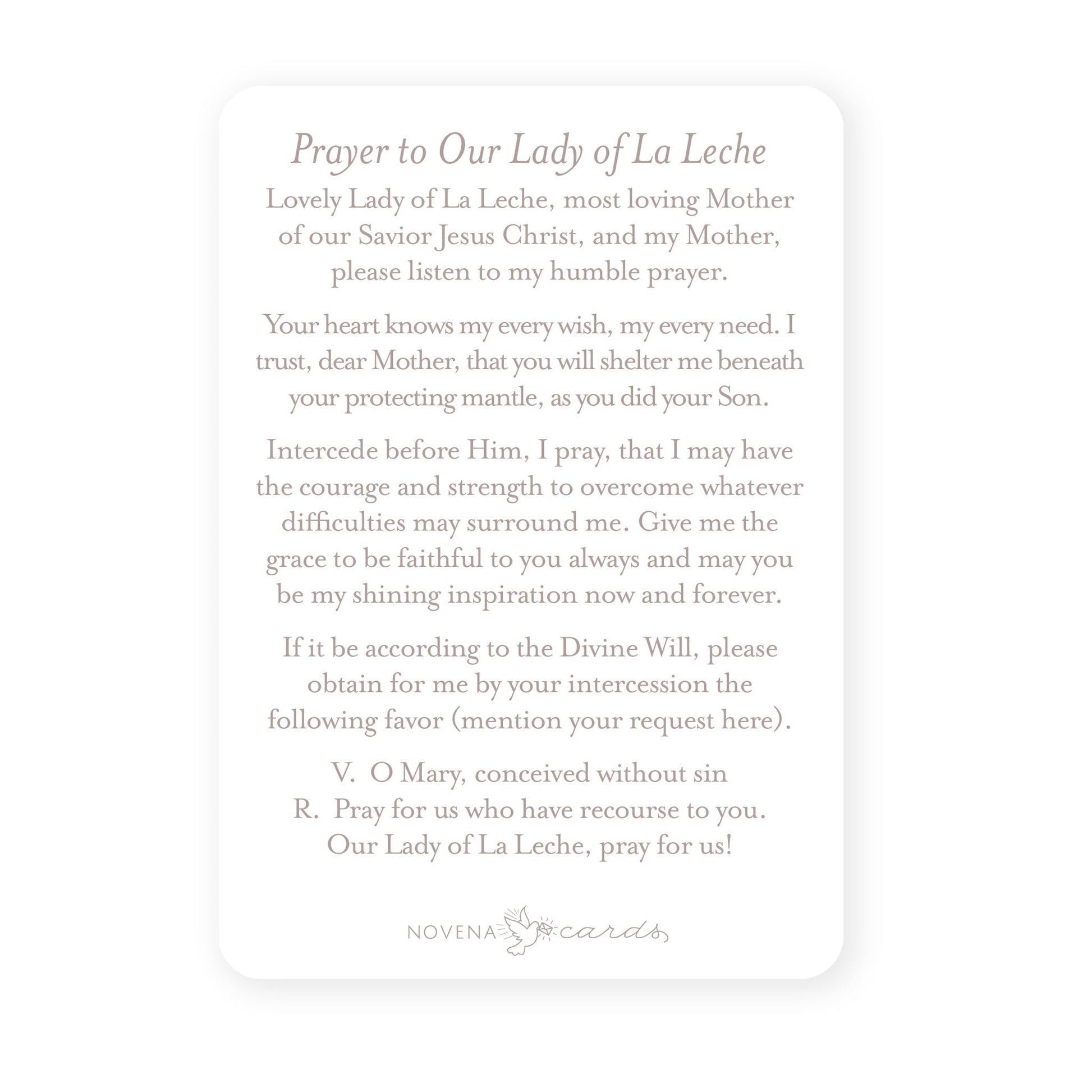 Do you or a loved one need prayer for nursing, to conceive, or for delivery of a child? Ask Our Lady of La Leche to pray for you or your loved one's intentions! This Catholic prayer card includes a traditional prayer asking the intercession of Our Lady of La Leche.