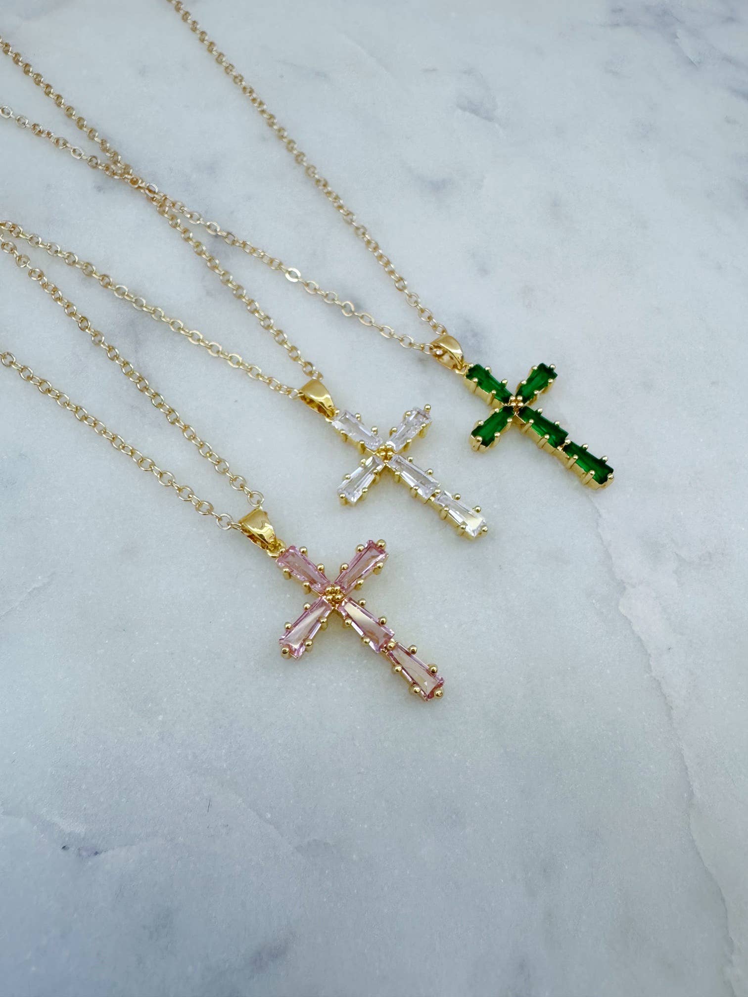 Religious Jewelry, CZ Cross Necklace, Mothers Day Gift: Pink cubic zirconia / 18" (popular)