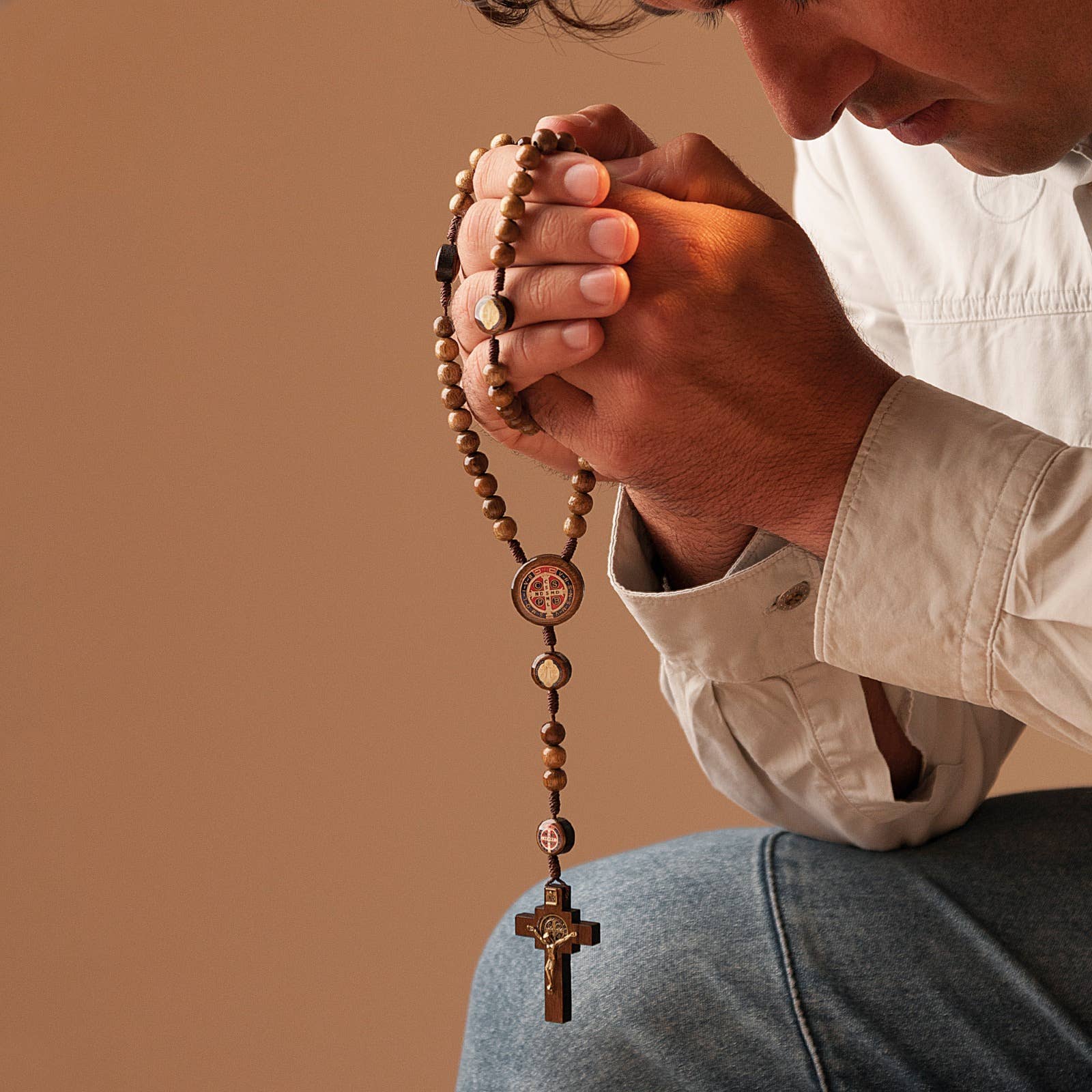 Beautiful hand made wooden rosary with St Benedict medals in every Our Father. Pray the rosary with this hand crafted wooden rosary. High quality workmanship, top of the line wooden beads, and all around a beautiful piece to display in your home or office