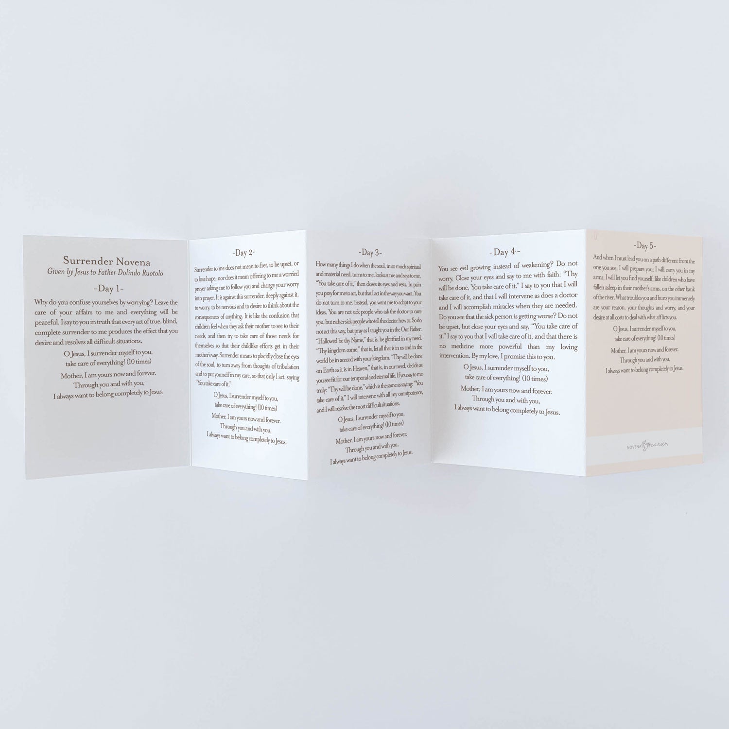 The prayer contains the words of Jesus guiding you through surrendering your fears, worries, and desires to Him. This special novena was given to Fr. Dolindo Ruotolo by Jesus in the 20th century. Just as Our Lord surrendered His Will to the Father's Will, this prayer helps you reflect on how much Jesus desires us to follow His example and surrender everything to Him.