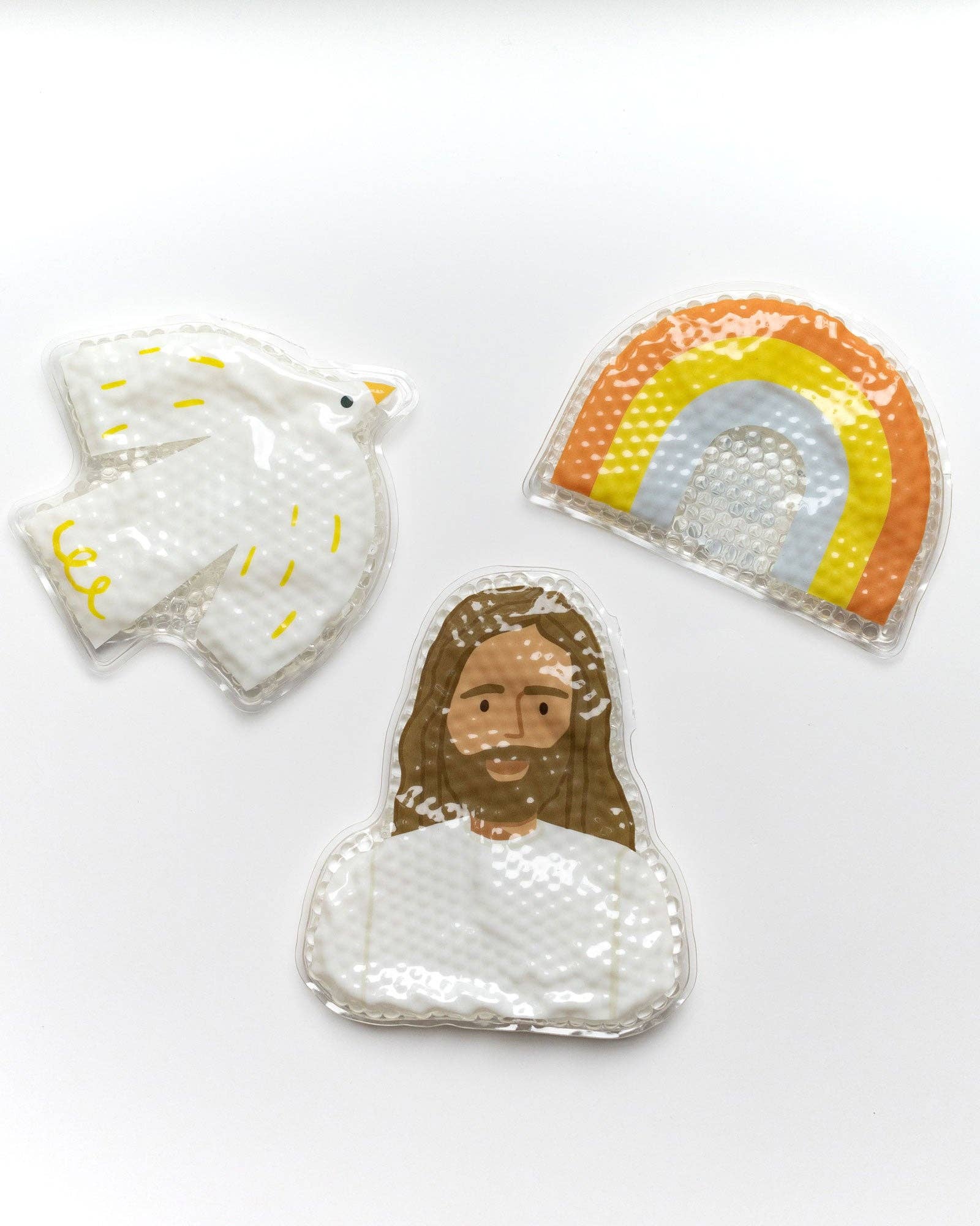The Trinity Hot and Cold Packs can be frozen or heated up for maximum comfort. It comes with 3 packs in the shape of Jesus, a Holy Spirit Dove, and a Rainbow.